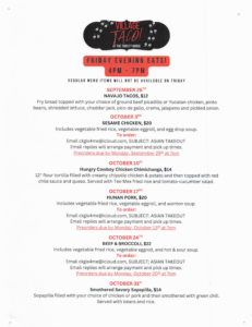 Rigby’s Road House Breakfast Drive Thru and online ordering system: Monday Oct. 13th open from 7:00am till 10:30am, Monday, Tuesday, and Wednesdays only. Breakfast burritos and will be adding items like breakfast sandwiches and some sort of sweet pastries in the following weeks. Orders can be placed at rigbysroadhouse.com or you can pull up next to the fireball camper and order there.